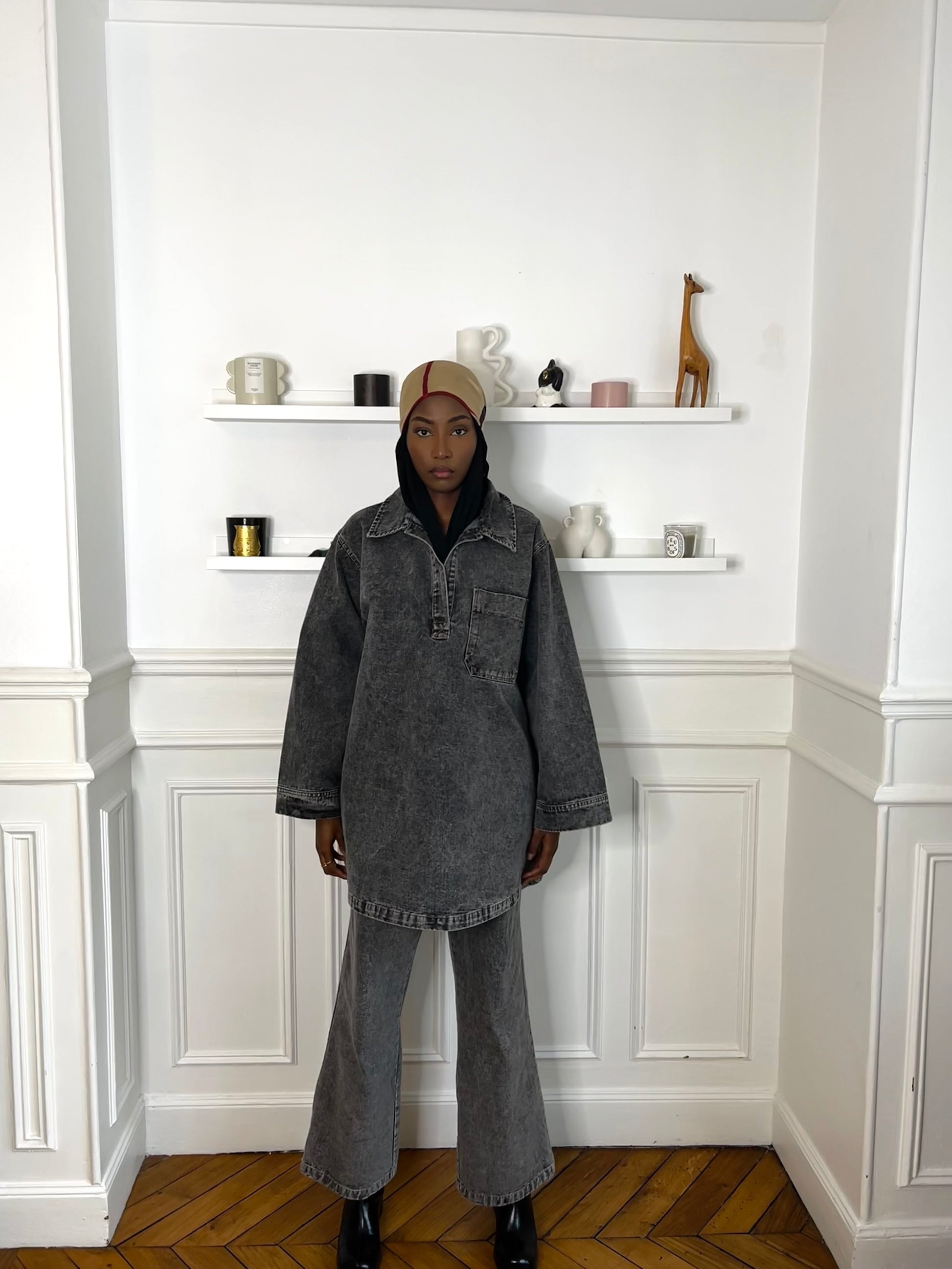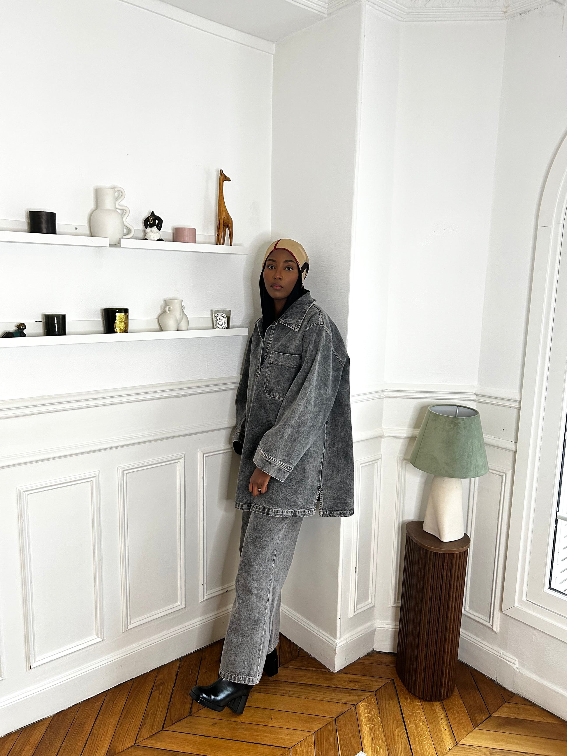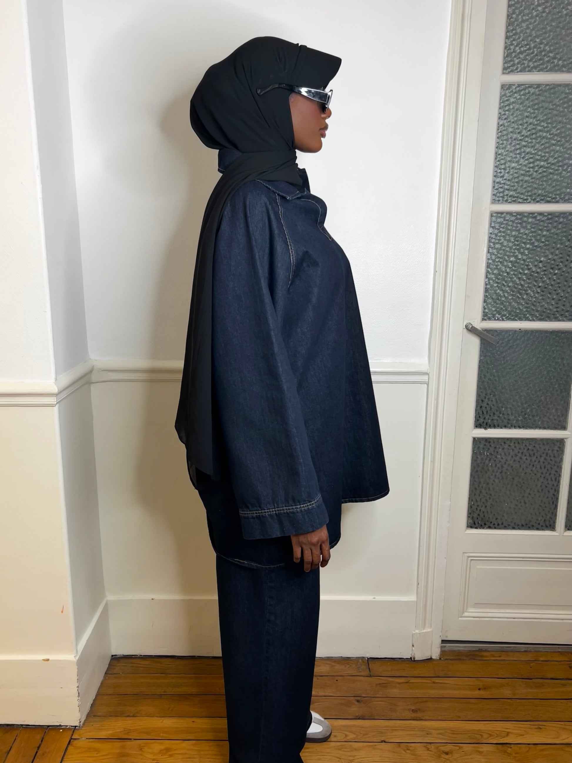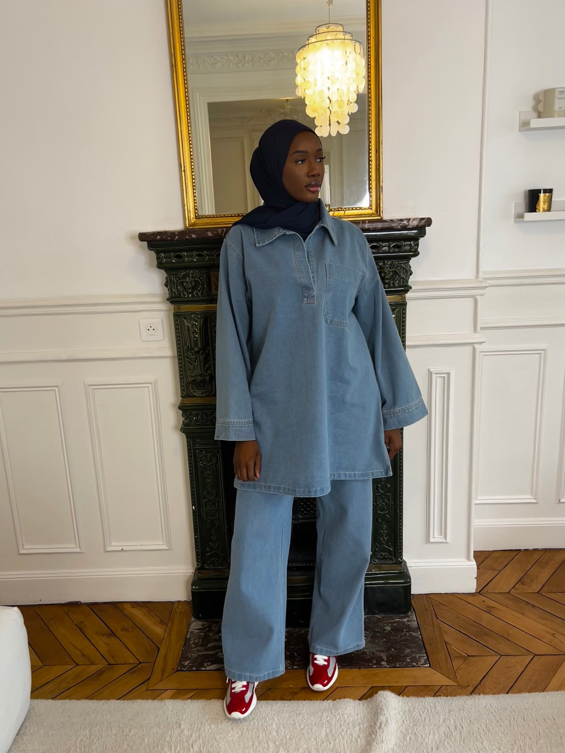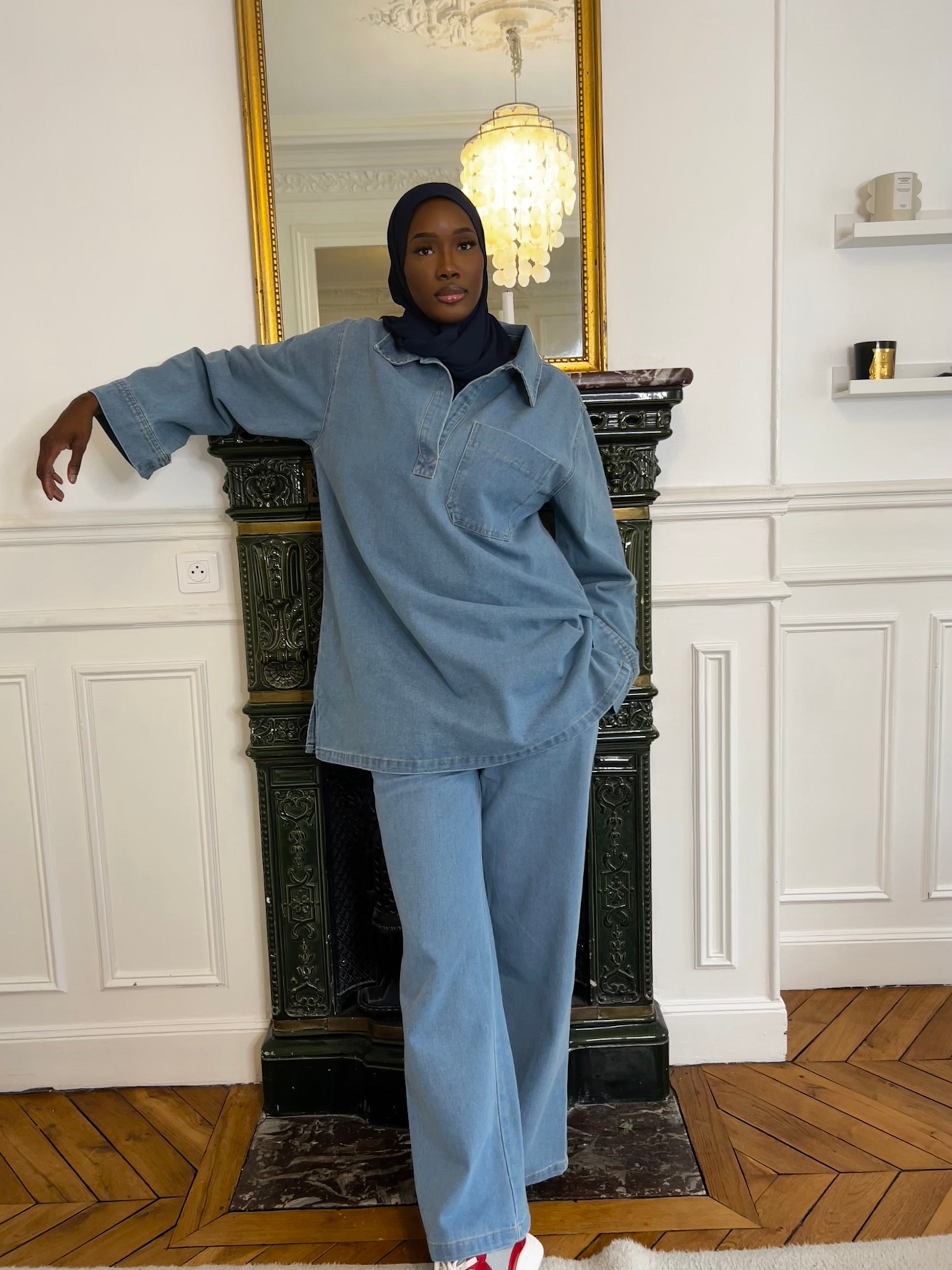 Découvrez notre ensemble denim oversize, un incontournable pour un look à la fois tendance et modeste. Conçu pour allier confort et style, cet ensemble se compose d'une chemise ample à poche plaquée et d'un pantalon coupe large, parfait pour une silhouette décontractée et élégante.