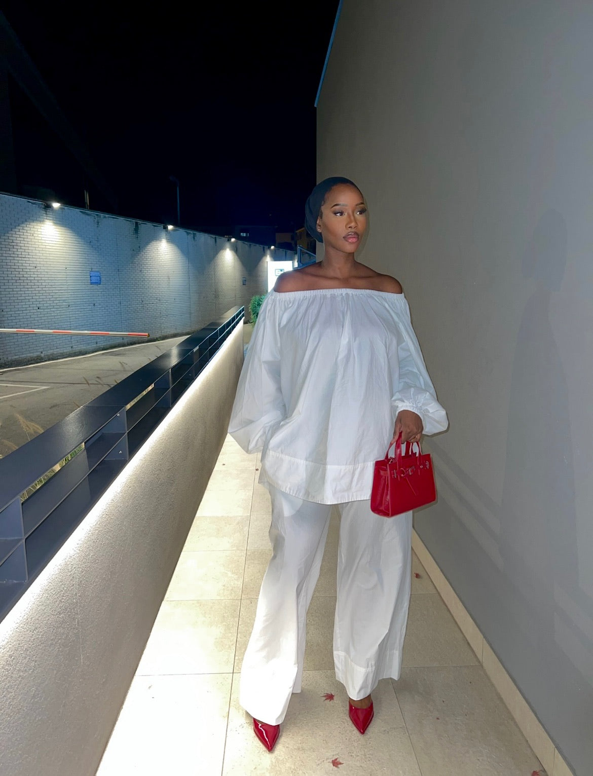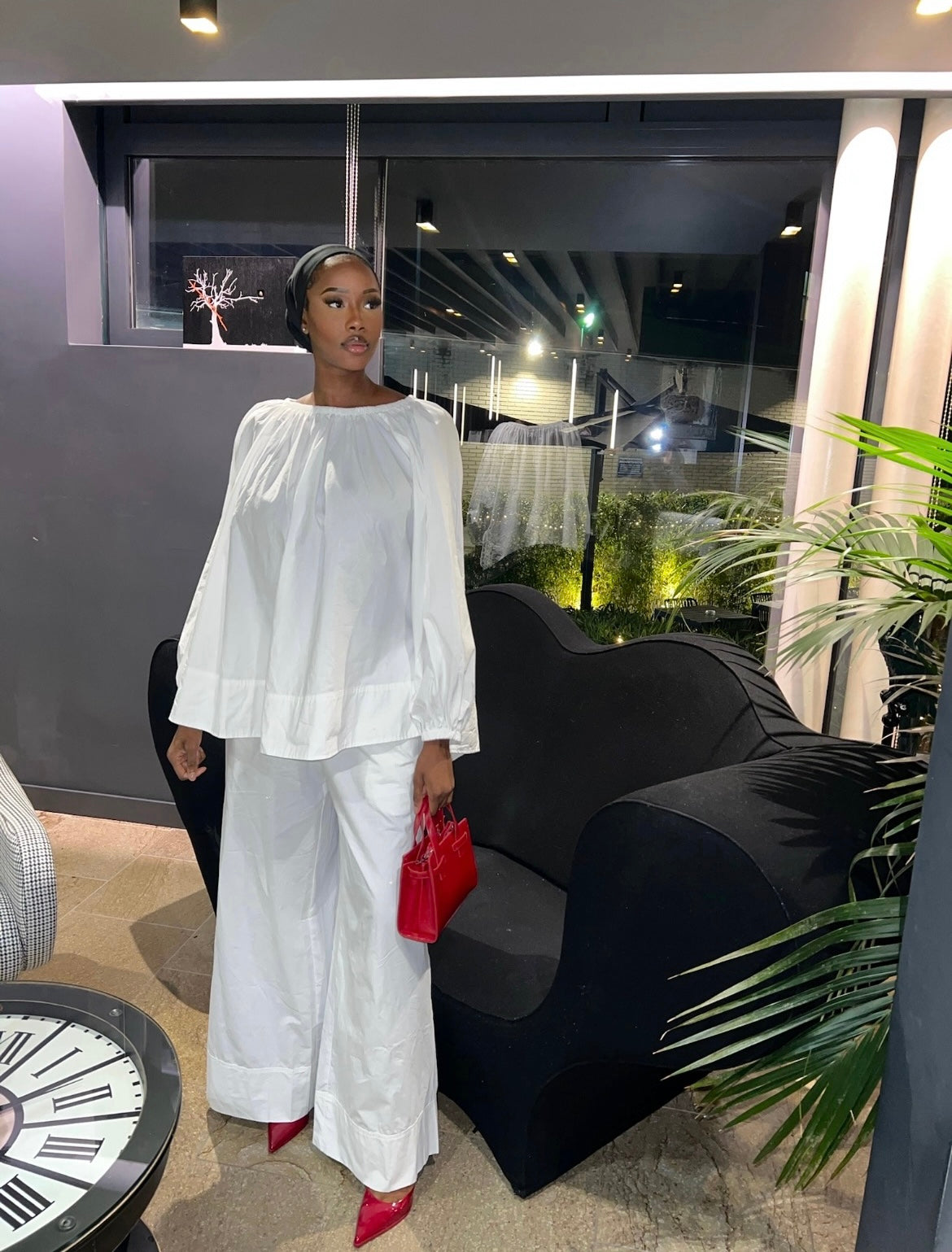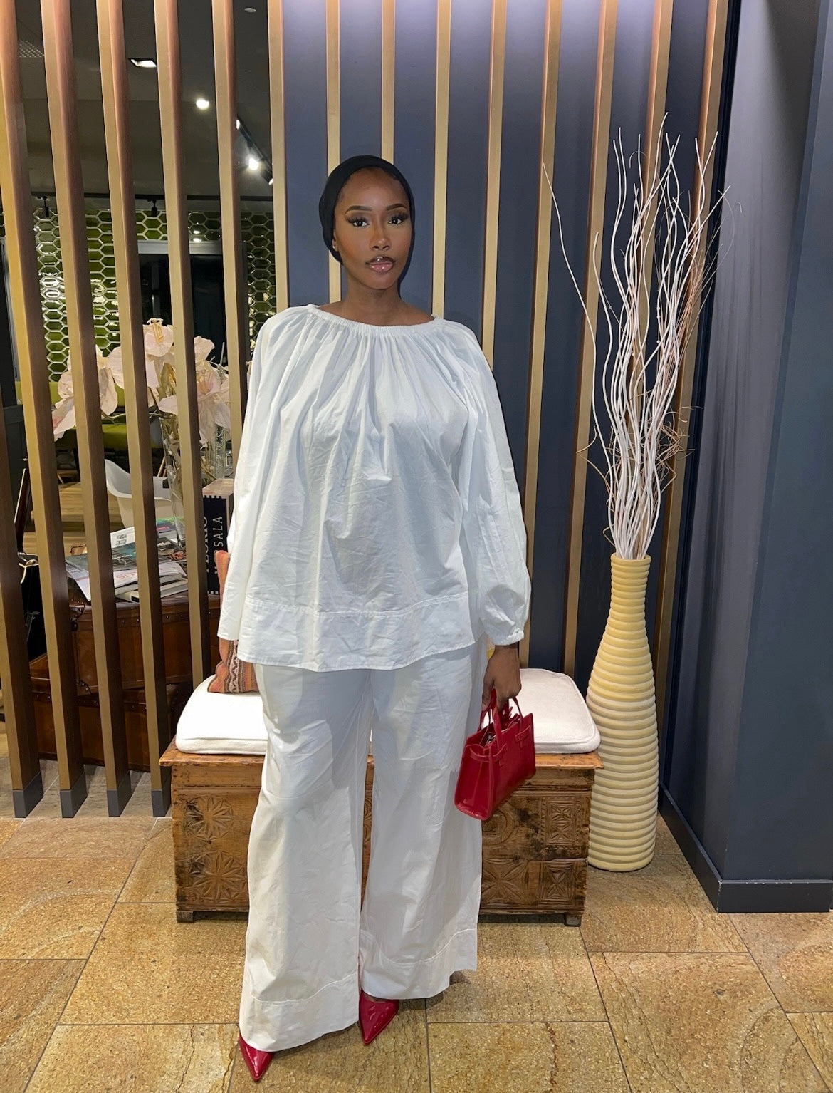 Ensemble élégant et minimaliste 100% coton, parfait pour allier confort et style. Composé d'un haut ample à épaules dénudées et manches ballon, et d'un pantalon fluide, il offre une silhouette raffinée et aérienne. Le mannequin mesure 1m77 et porte une taille deux.