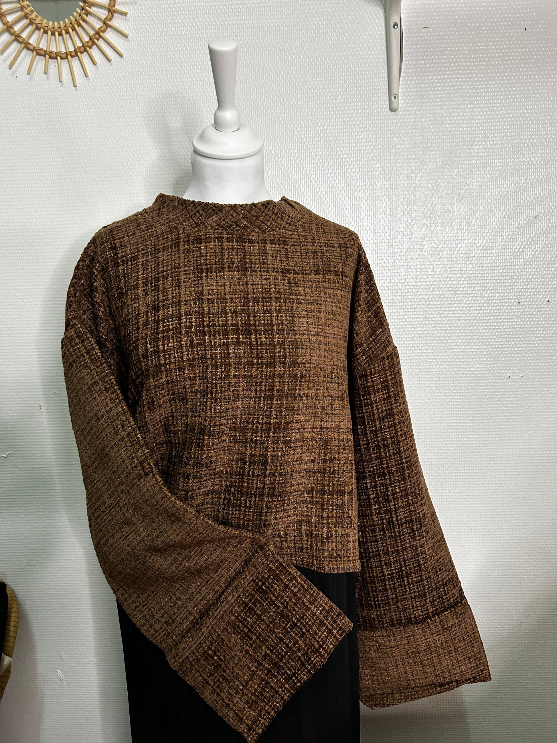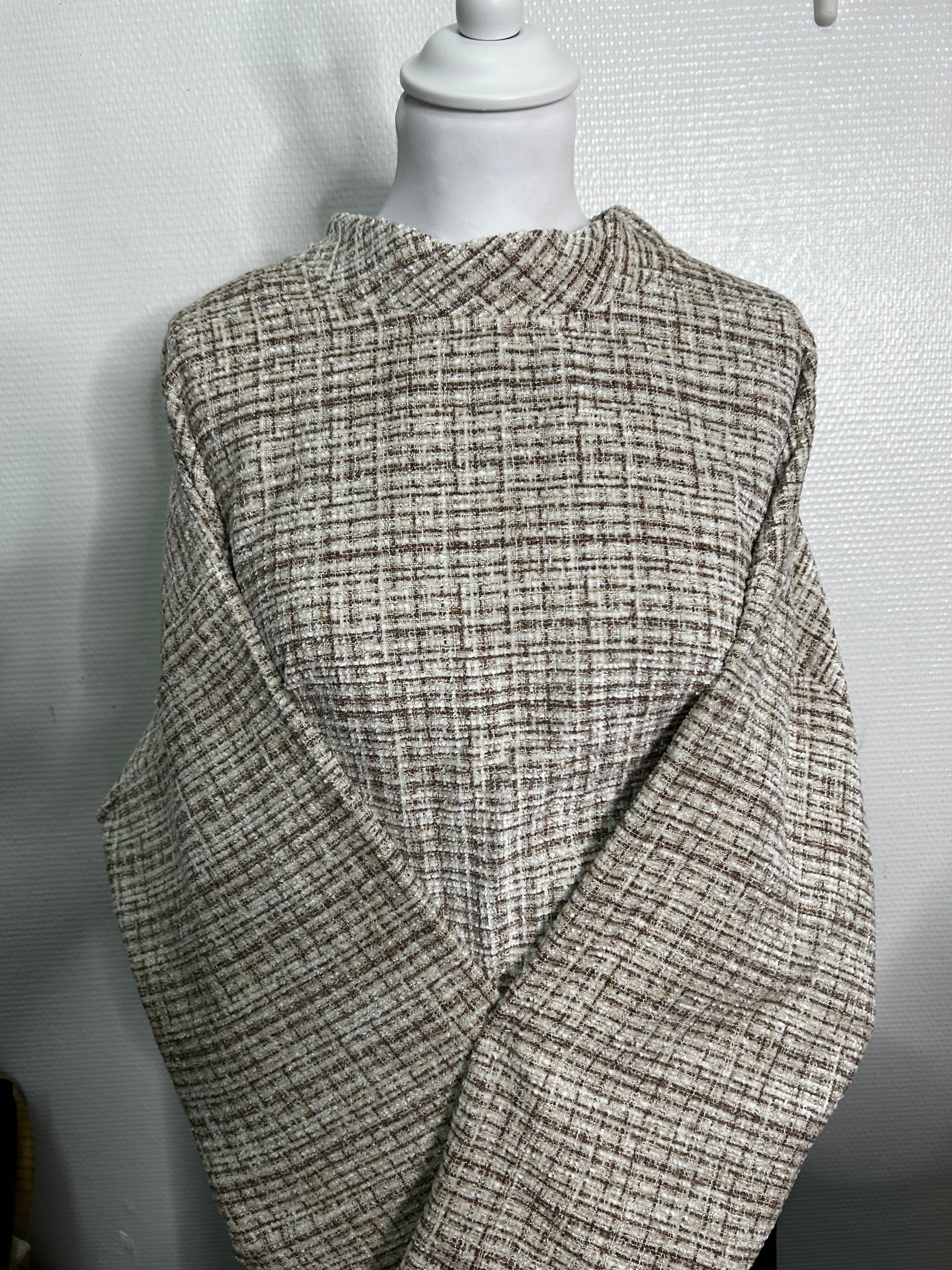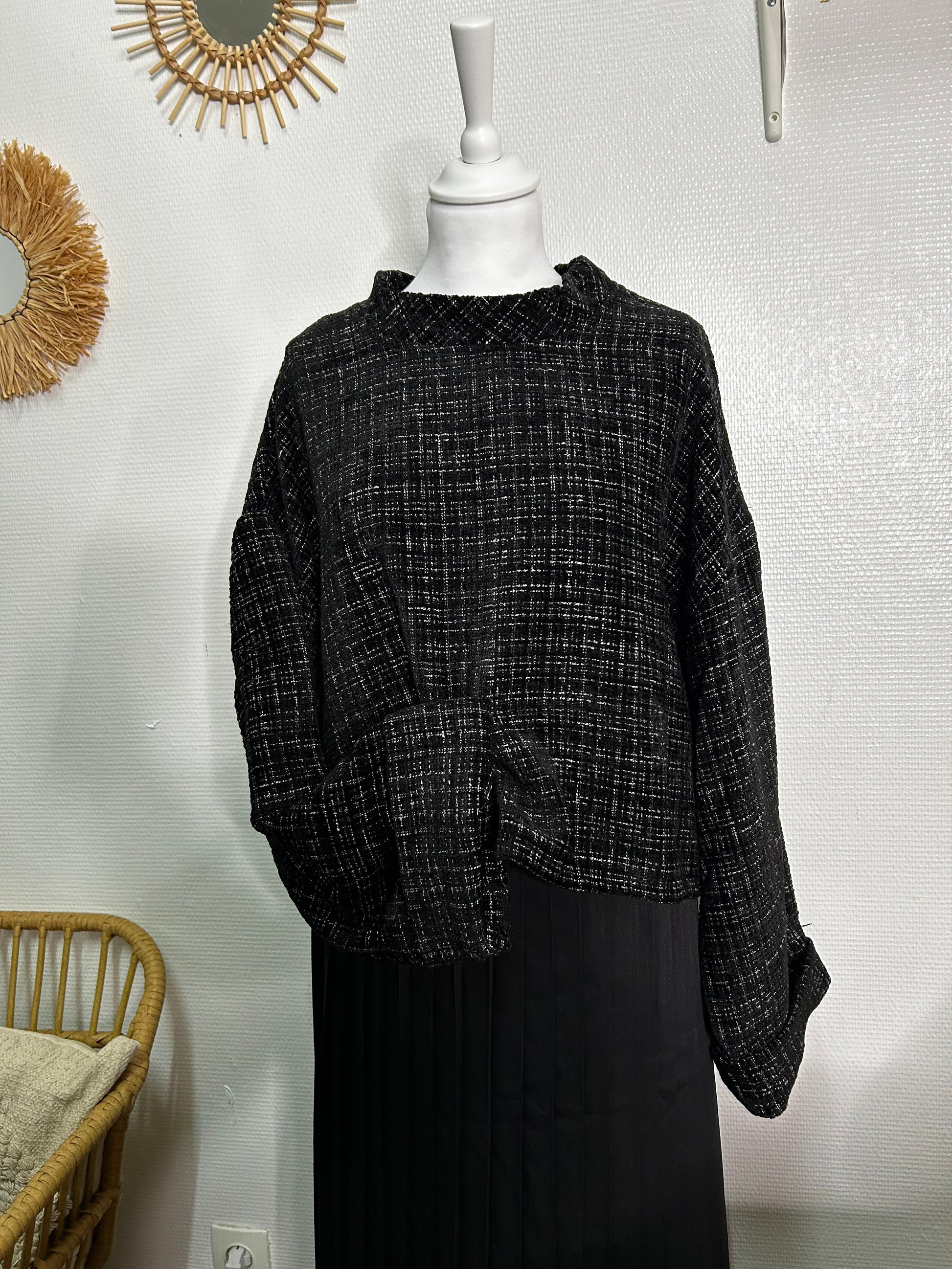 Ce haut chic et intemporel allie élégance et confort grâce à son tissu texturé au style tweed. Son col montant ajoute une touche sophistiquée, tandis que sa coupe oversize assure une grande liberté de mouvement et un look moderne.
