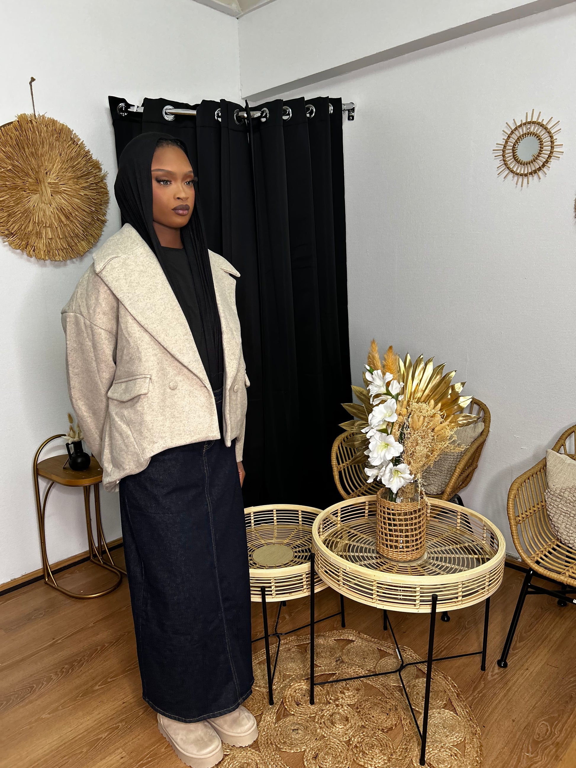 le mannequin qui porte la veste en beige mesure 1m68 et porte du S en vêtement.